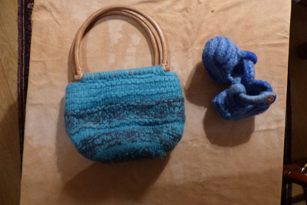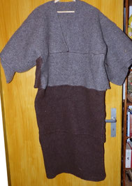 Entstanden ist die Idee mit dem Filzen durch eine pure Notwendigkeit. In Schwitzhütten friere ich leicht, weil ein Handtuch nass und kalt wird auf dem Boden. Wolle isoliert, auch wenn sie nass ist. So fing ich an aus Filzwolle rechteckige Stücke zu stricken, diese dann in der Waschmaschine zu filzen und schließlich zusammen zu nähen. Entstanden ist zunächst eine Decke, die ich dann zu einer Art Poncho oder Überwurf weiter "gestrickt/gefilzt" habe - ein Stück mit mehreren Funktionen - auch im Sommer beim Sitzen im Garten - oder beim Yoga im Freien als Yoga-Matte verwendbar.