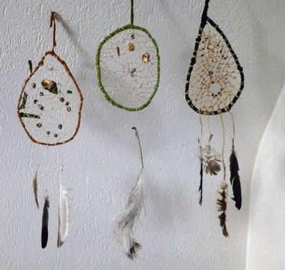 Man kann aus allem, was man so unterwegs findet wunderbar Dreamcatcher basteln. Original sind sie tränenförmig und das geht mit einem dünnen Zweig, den man mit einem Lederbändel umwickelt wunderbar. Dann wird von außen nach innen das Netz mit einem Baumwollfaden "gesponnen" und dabei, wenn gewünscht Muscheln und Steine mit eingewoben. Am Schluss ein paar Federn aufgehängt und fertig ist der Dreamcatcher